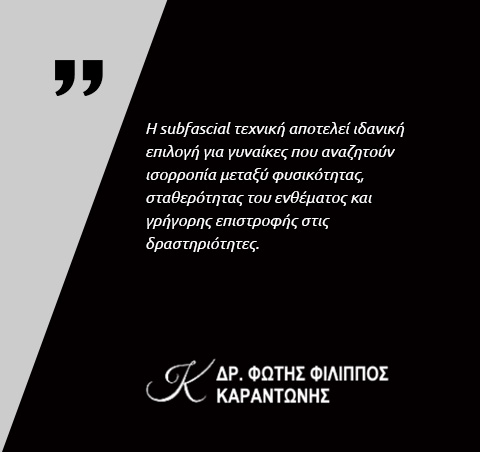 Η subfascial τεχνική αποτελεί ιδανική επιλογή για γυναίκες που αναζητούν ισορροπία μεταξύ φυσικότητας, σταθερότητας του ενθέματος και γρήγορης επιστροφής στις δραστηριότητες.